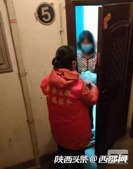 莲湖区土门街道汉城东路社区工作人员给小女孩送餐。