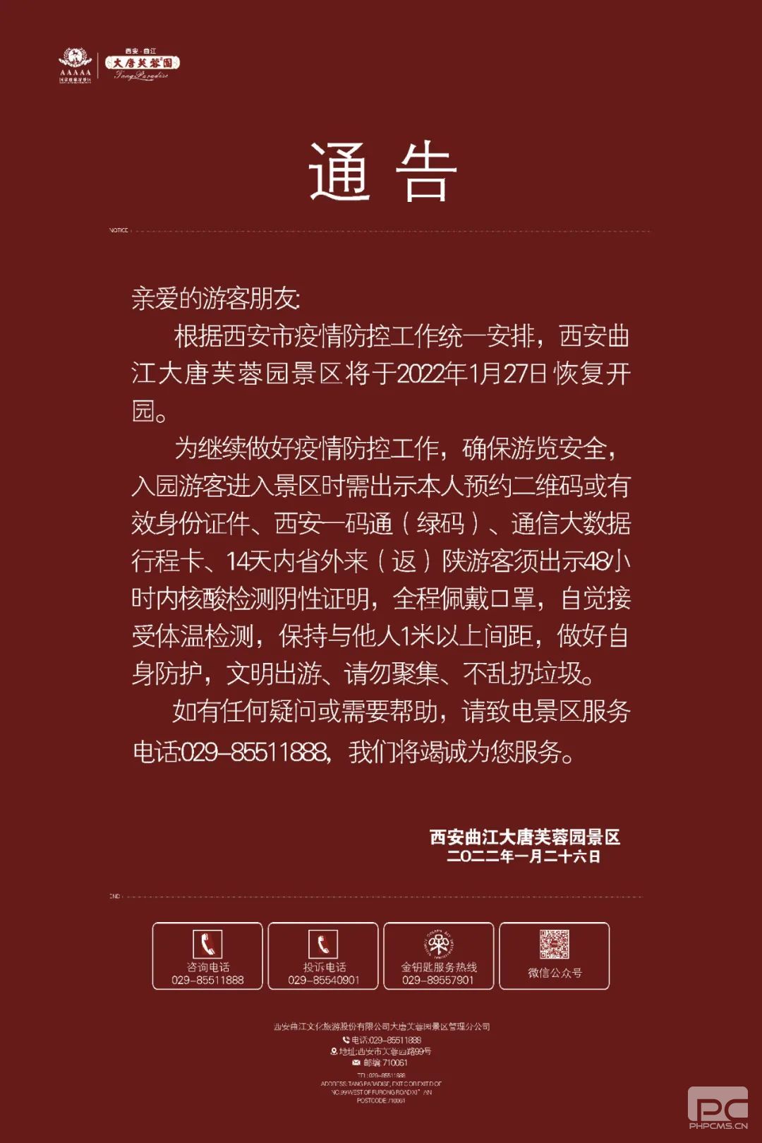 西部网讯(记者 韩睿) 记者从西安曲江大唐芙蓉园了解到,根据西安市疫情防控工作统一安排,西安曲江大唐芙蓉园景区明日(1月27日)恢复开园。