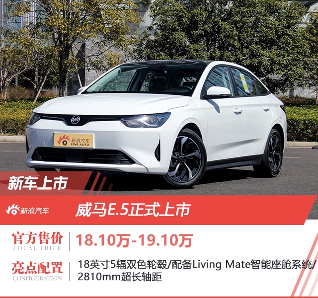 4月15日,威马E.5(配置|询价)正式上市,售价区间为18.10万-19.10万元。此次威马推出两款车型,分别是全新威马E.5 Pro和全新威马E.5 智客行。新车拥有2810mm的超长轴距,续航里程为505KM。