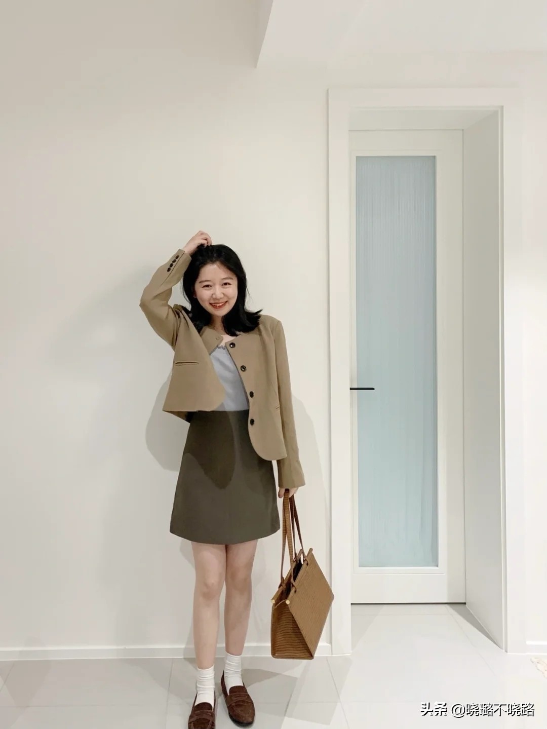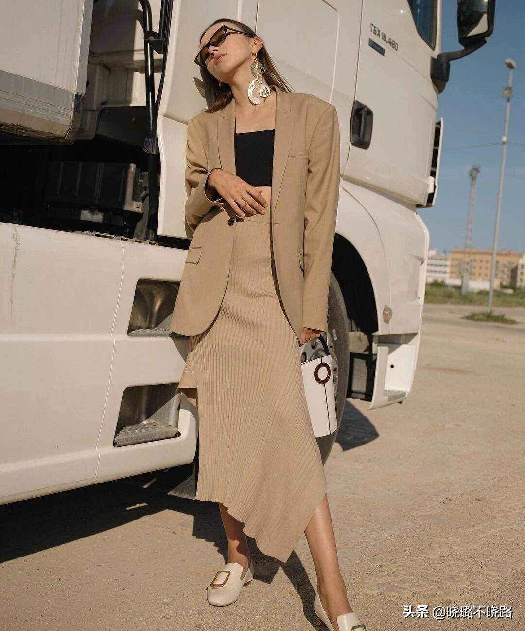 不规则半身裙+短打上衣+西装外套+乐福鞋:短打上衣的小性感需要西装外套来中和一下,不规则半身裙优雅有设计感,外套半身裙选同色系,再搭配同色系乐福鞋,高级又随性。
