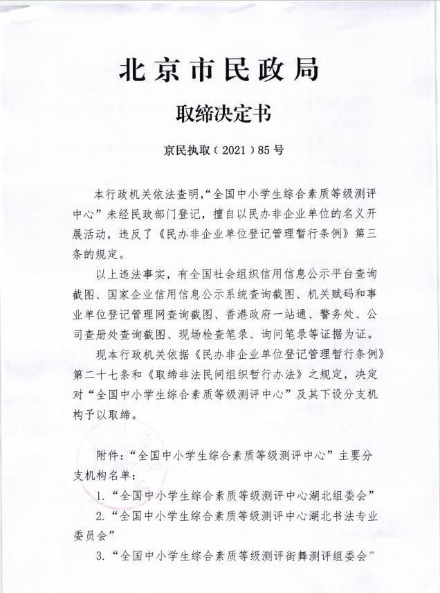 2021年10月,北京市民政局经过调查,认定“全国中小学生综合素质等级测评中心”未经登记,擅自以民办非企业单位名义进行活动,违反了《民办非企业单位登记管理暂行条例》规定。依据《民办非企业单位登记管理暂行条例》和《取缔非法民间组织暂行办法》规定,北京市民政局对其及下设分支机构依法作出取缔决定。2021年11月,执法人员到该“中心”办公地点进行现场取缔,并在北京市民政局官方网站进行了公告。