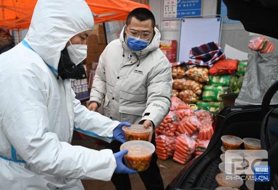 1月8日,志愿者(右三)在为防疫一线人员发放“爱心餐”。